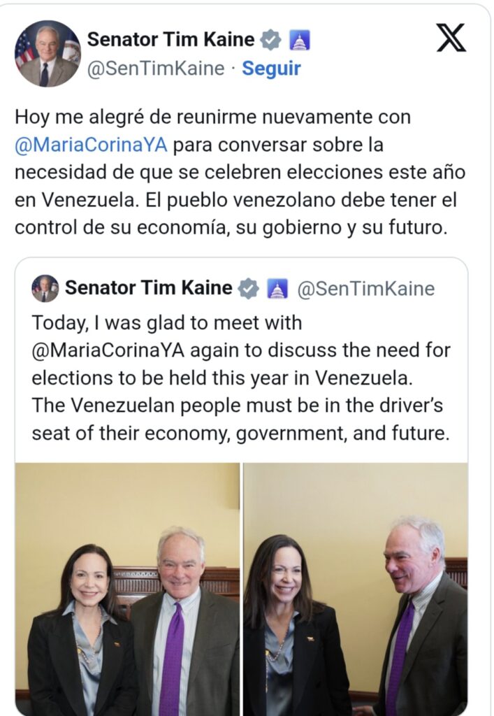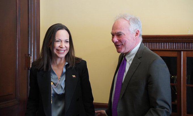 El senador demócrata Tim Kaine se reunió este jueves 29 de enero con María Corina Machado, premio Nobel de la Paz.
