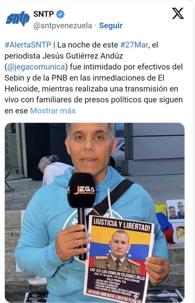 El Sindicato Nacional de Trabajadores de la Prensa (SNTP) denunció este sábado que el periodista Jesús Gutiérrez Andúz fue intimidado por funcionarios del Servicio Bolivariano de Inteligencia Nacional (Sebin) y de la Policía Nacional Bolivariana (PNB) mientras hacía una transmisión en vivo en las inmediaciones de El Helicoide, en Caracas.