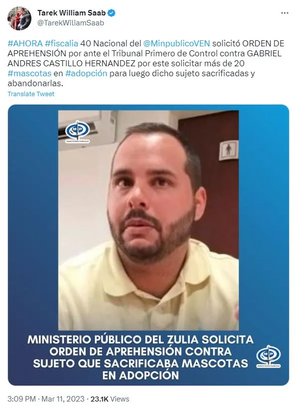 La Fiscalia 40 del Ministerio Público del Zulia solicitó, este sábado 13 de marzo, una orden de aprehensión contra Gabriel Andrés Castillo Hernández, por adoptar más de 20 mascotas para presuntamente “sacrificarlas y abandonarlas”.