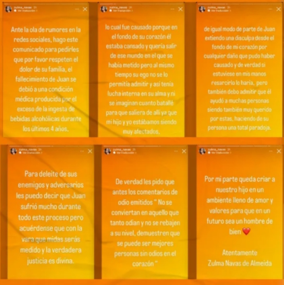 “Ante la ola de rumores en la redes sociales, hago este comunicado para pedirles que por favor respeten el dolor de su familia, el fallecimiento de Juan se debió a una condición médica producida por el exceso de la ingesta de bebidas alcohólicas durante los últimos cuatro años”, comentó Navas en una publicación que hizo en sus historias de Instagram.
