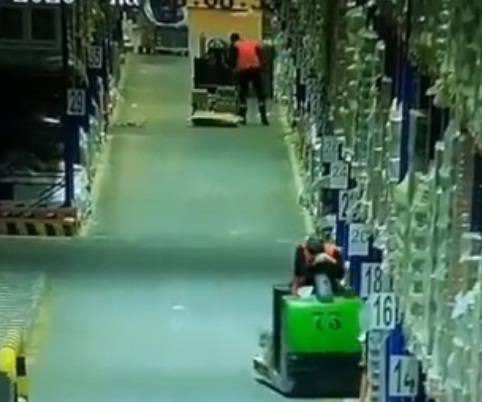 Un vídeo muestra el momento en el cual un trabajador se queda dormido, choca y causa un «derrumbe laboral» en el almacen donde se encuentra.