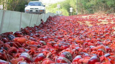 Como parte de su migración anual hacia el océano, millones de cangrejos pintaron de color rojo las carreteras y caminos…