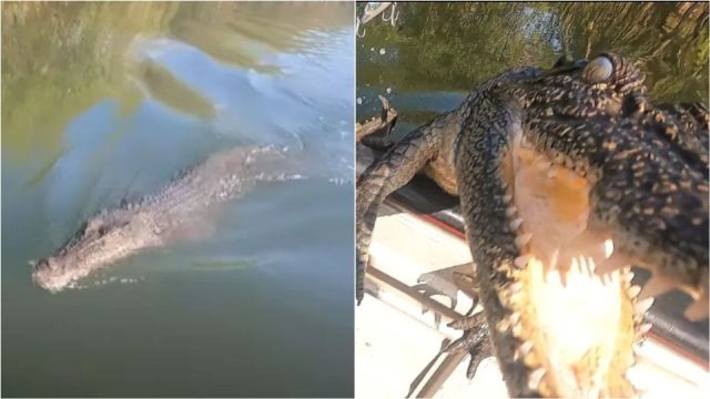 El enorme cocodrilo intenta subir a bordo, golpeando su cabeza contra la cámara que lo estaba capturando.