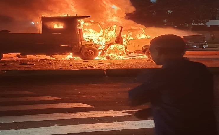 Medios locales reseñan que un camión de plataforma se estrelló contra una camioneta a pocos metros de la Clínica Humana y luego ambos vehículos se incendiaron del impacto.