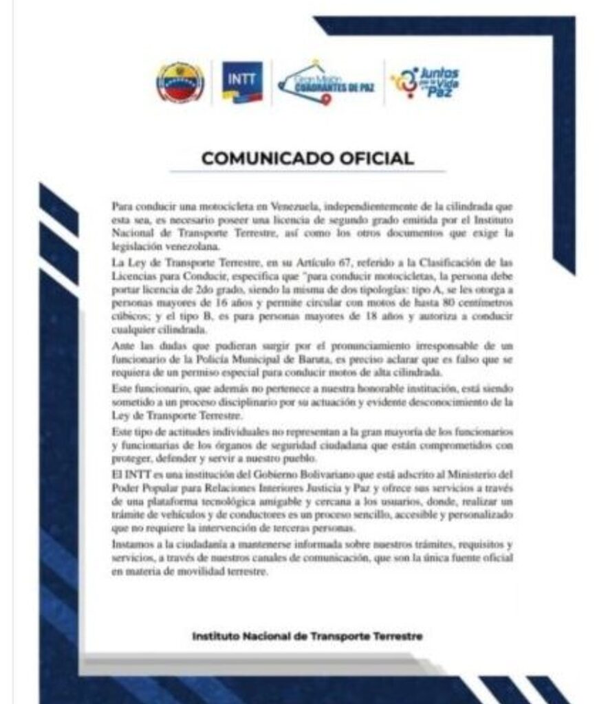 En este sentido, el presidente del INTT, Gabriel Aguana Rodríguez, publicó en su cuenta de la red social X un comunicado donde insta a la ciudadanía a no caer en falsas informaciones dadas por funcionarios irresponsables que desconocen la ley.