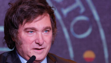 El presidente electo de Argentina, Javier Milei, ofrece un discurso en el «búnker» electoral tras conocer los resultados que le…