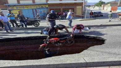 Un motorizado cae en un «mega hueco», este domingo en la avenida Florencio Jiménez, a la altura de Pueblo Nuevo,…