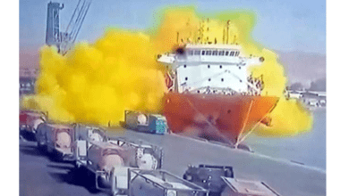 Una grúa que cargaba tanques de cloro en un barco en el puerto jordano de Áqaba dejó caer el lunes…