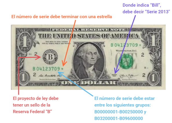 Tienen que haber sido emitidos por la Reserva Federal de Nueva York, en su serie correspondiente a 2013. Su identificación debe encontrarse entre los números de serie B00000001 y B00250000, o bien entre los números de serie B03200001 y B09600000. Además, el billete debe contener un sello de la Reserva Federal con la letra “B”. Y el número de serie debe terminar con la imagen de una estrella.