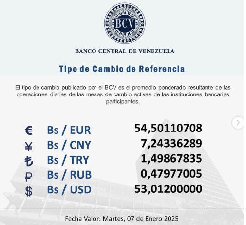 Para este lunes 6 de enero la tasa del dólar oficial BCV se ubica en 53,01 Bolívares, luego que el pasado viernes 3 cerrara la jornada en ese valor, de acuerdo a lo publicado por el Banco Central de Venezuela.La tasa del dólar oficial BCV registró una nueva subida del 0,44 céntimos en comparación al valor que tenía al inicio del cierre de la primera semana de enero.