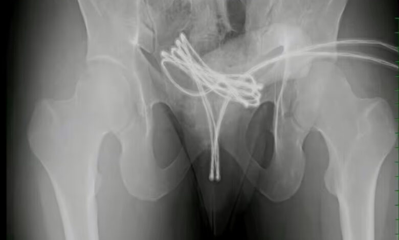 Las radiografías revelaron que el cable estaba doblado dentro de su cuerpo, con un extremo sobresaliendo de la uretra.Los intentos manuales para retirar el cable fueron infructuosos.