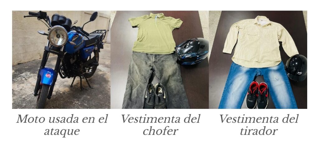 El director del Cicpc mostró en sus redes las evidencias incautadas en los procedimientos: la motocicleta Bera azul utilizada el día del atentado, dos armas de fuego tipo revólver y la indumentaria utilizada por los hampones para cometer el hecho.