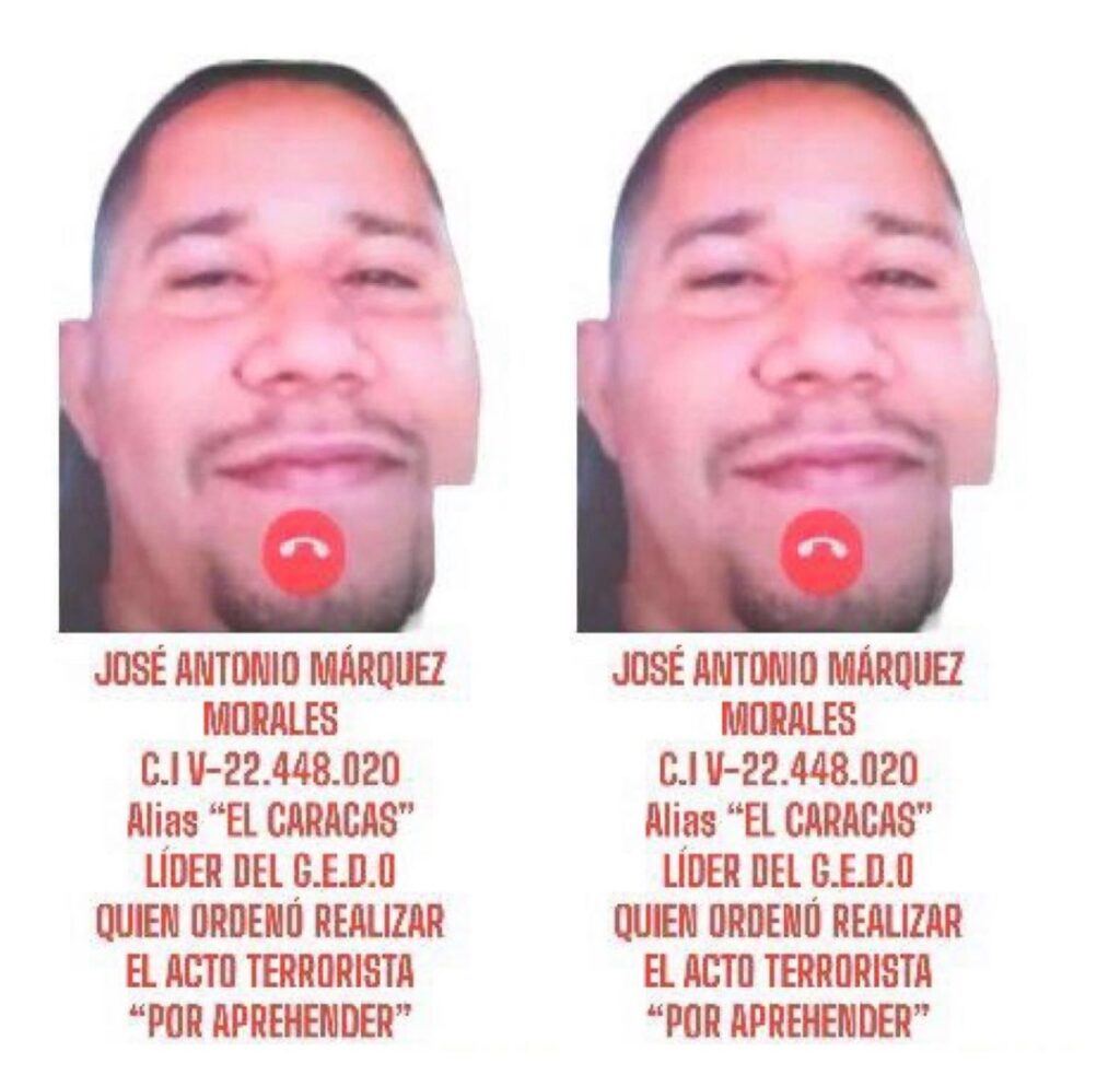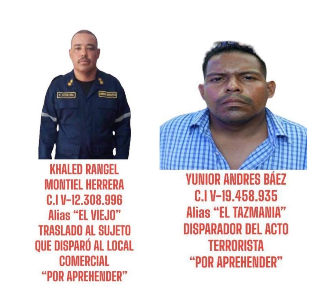 Asimismo, el jefe policial detalló en su cuenta Instagram, @douglasricovzla, faltan por aprehender el sujeto que disparó e hirió a las cinco personas en “Samba”, Júnior Andrés Báez (33); Khaled Rangel Montiel Herrera, alias “El Viejo”, quien trasladó a Júnior hacia otra moto conducida por Jhon; y el famoso alias “El Caracas”, José Antonio Márquez Morales, quien ordenó realizar el atentado terrorista.