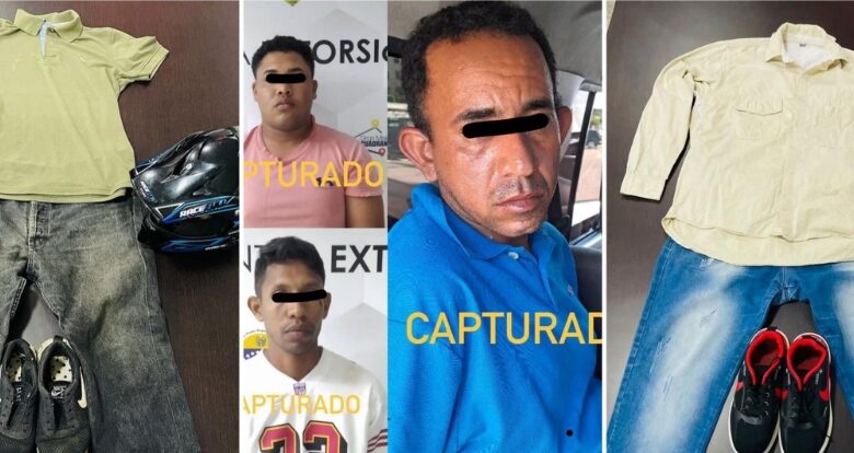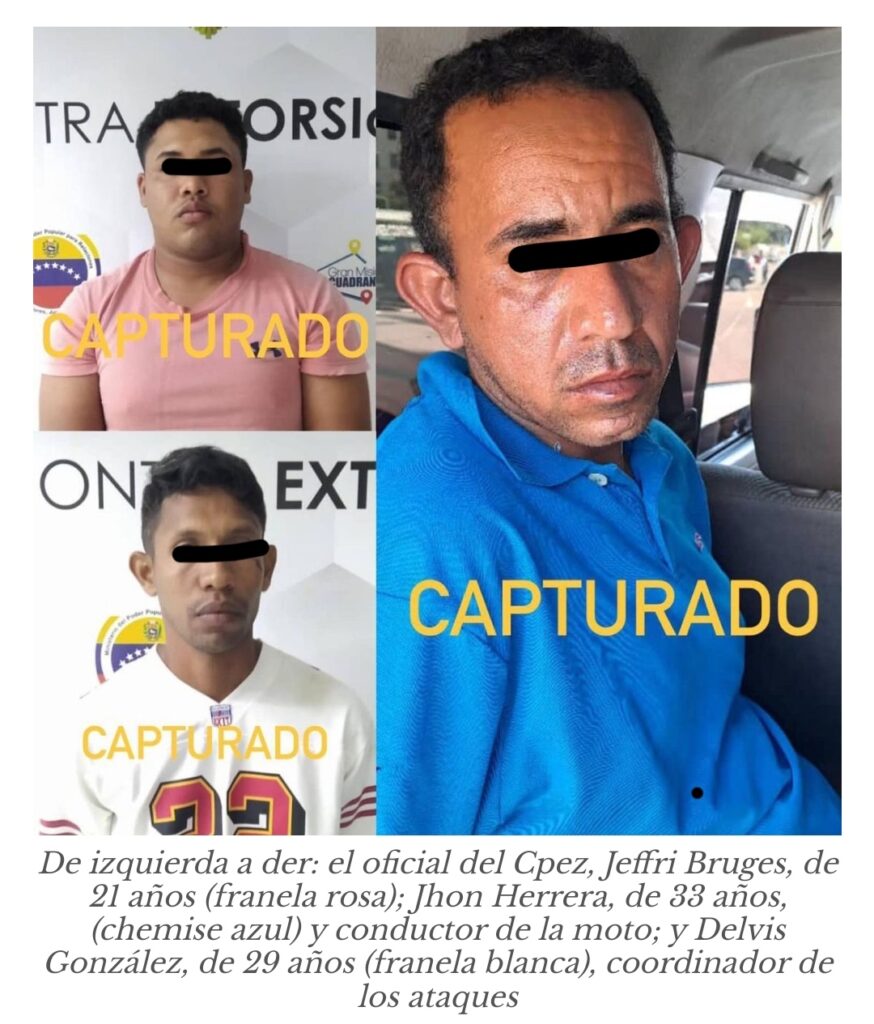 Los detenidos son Jhon Dervis Herrera (33) y conductor de la moto (chemise azul) Bera azul utilizada para trasladar al tirador de “Samba”; Delvis Manuel González (29), concuñado de Jhon (franela blanca) y quien coordinó los vehículos, participantes y el sitio de planificación del ataque; y el oficial de la Policía del estado Zulia, Jeffri Alfonso Bruges Ávila (21), encargado de organizar (franela rosa) la venta de la moto Bera azul