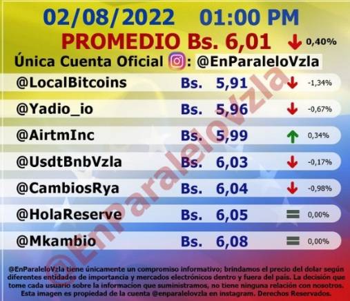 Los precios oscilan entre un mínimo de 5,91 bolívares por dólar y un máximo de 6,08 bolívares.