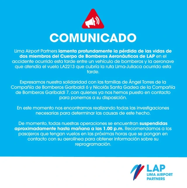 “Lima Airport Partners lamenta profundamente la pérdida de las vidas de dos miembros del Cuerpo de Bomberos Aeronáuticos del Cuerpo de Rescate de LAP” en el accidente ocurrido este viernes entre un avión de Latam y un vehículo de bomberos en la pista de aterrizaje.