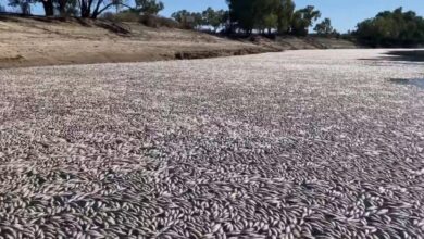 Millones de peces muertos y en estado de creciente putrefacción bloquean un tramo de río en una remota localidad en…