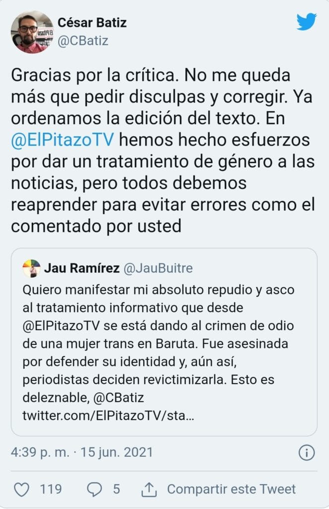 Entretanto, un usuario de twitter manifestó su rechazo al tratamiento que se dio en el portal El Pitazo a este hecho ante lo que denunció que «Fue asesinada por defender su identidad y, aún así, periodistas deciden revictimizarla. Esto es deleznable». Ante la crítica la directiva del portal pidió disculpas y ordenó la edición del texto.