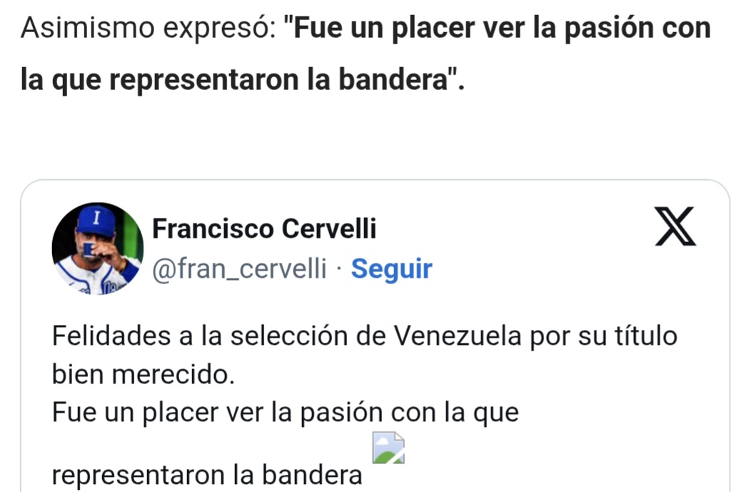 El mánager de Italia, Francisco Cervelli, se viralizó en las redes sociales tras felicitar a Venezuela por ganar el campeonato del Clásico Mundial de Béisbol 2026, tras derrotar a Estados Unidos con pizarra de 3-2.