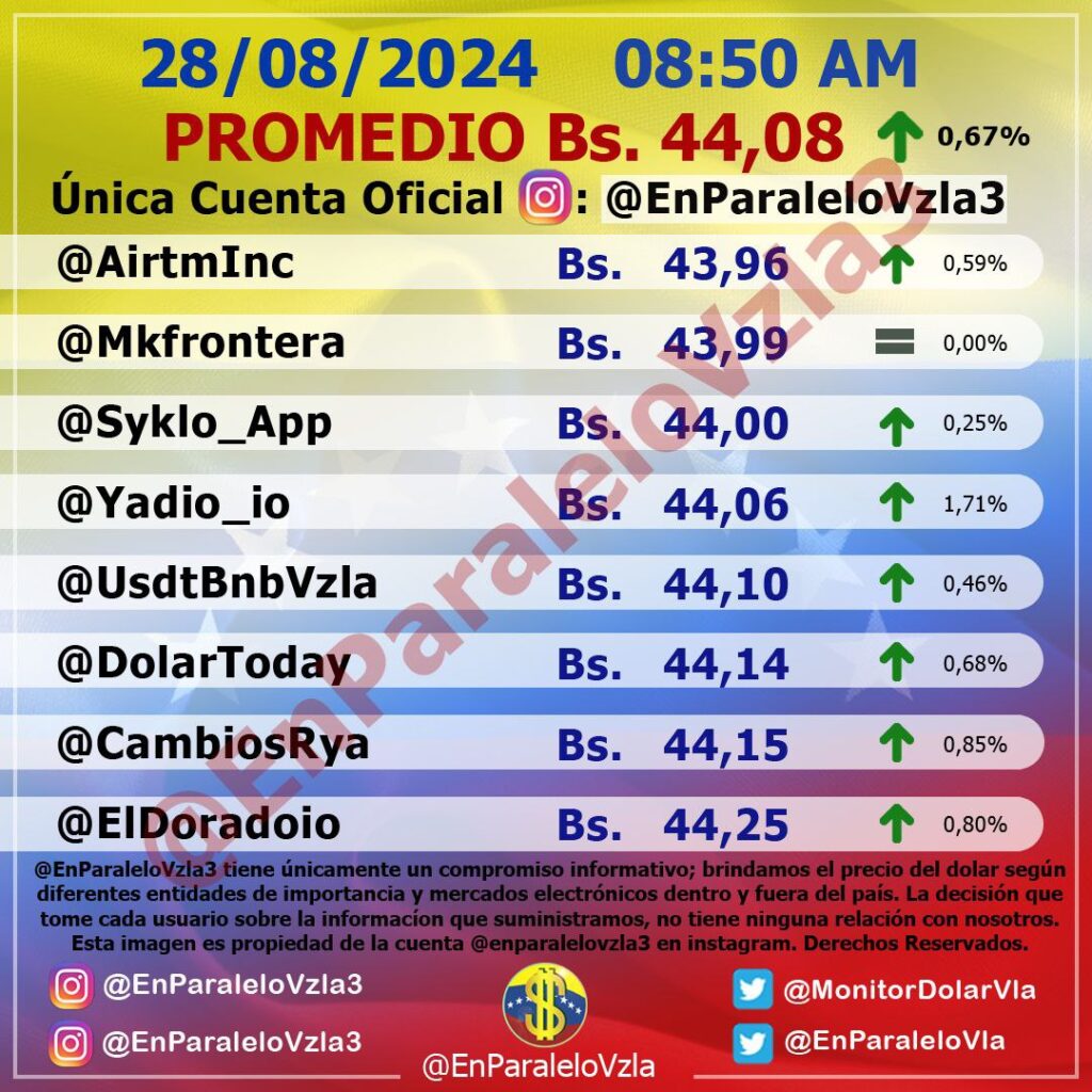 El dólar paralelo inició la jornada de este 28 de agosto con tendencia alcista al cotizarse en Bs. 44,08.