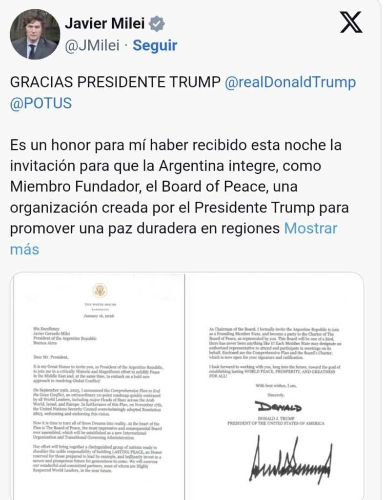 El presidente de Argentina, Javier Milei, anunció este sábado (17.01.2026) que recibió una invitación del mandatario estadounidense, Donald Trump, para sumarse como miembro fundador del «consejo de paz» para Gaza anunciado el jueves pasado, que según Washington abordará cuestiones como el «fortalecimiento de la capacidad de gobernanza, relaciones regionales, reconstrucción, atracción de inversiones, financiación a gran escala y movilización de capital«.