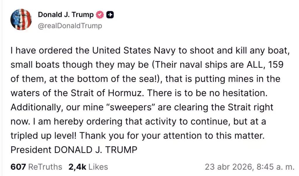 A través de un mensaje publicado en su red social Truth Social, el mandatario advirtió que las fuerzas navales tienen autorización para “disparar a matar” contra cualquier barco, incluso de pequeño tamaño, que represente una amenaza en la zona.