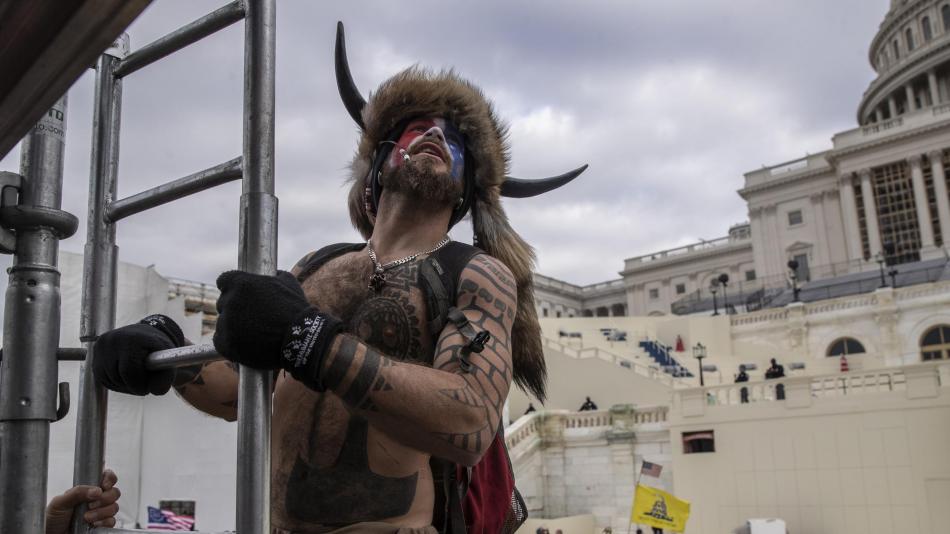 Jacob Anthony Chansley Hombre con cachos, dirigente de la supremacia blanca y de grupos de extrema derecha, racistas e incitadores de violencia.