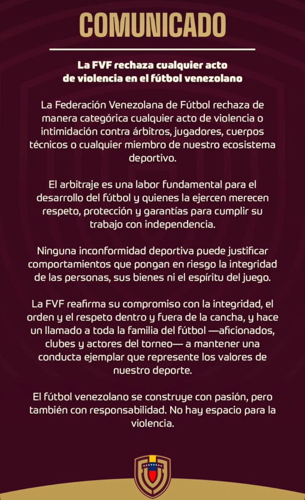 “El fútbol venezolano se construye con pasión, pero también con responsabilidad. No hay espacio para la violencia”, indicó.