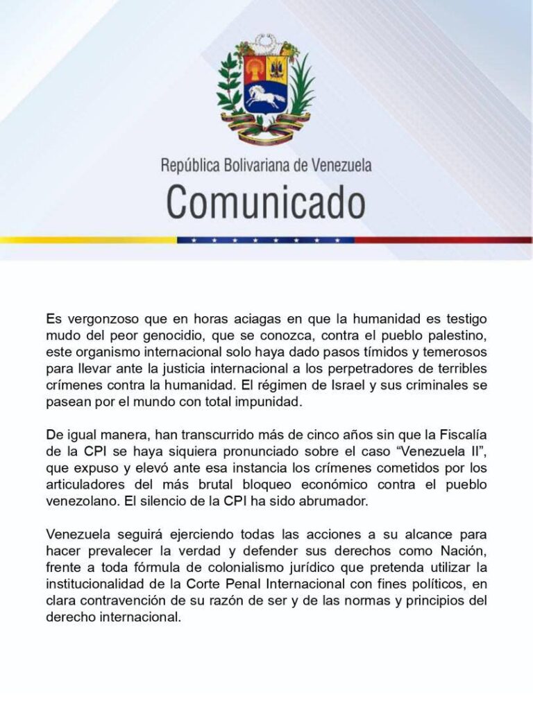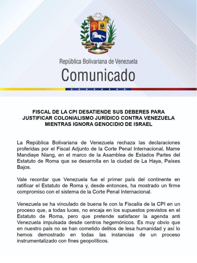«Venezuela se ha vinculado de buena fe con la Fiscalía de la CPI en un proceso que, a todas luces, no encaja en los supuestos previstos en el Estatuto de Roma, pero que pretende satisfacer la agenda antiVenezuela impulsada desde centros hegemónicos«, indicó la Cancillería en un comunicado publicado en Telegram.