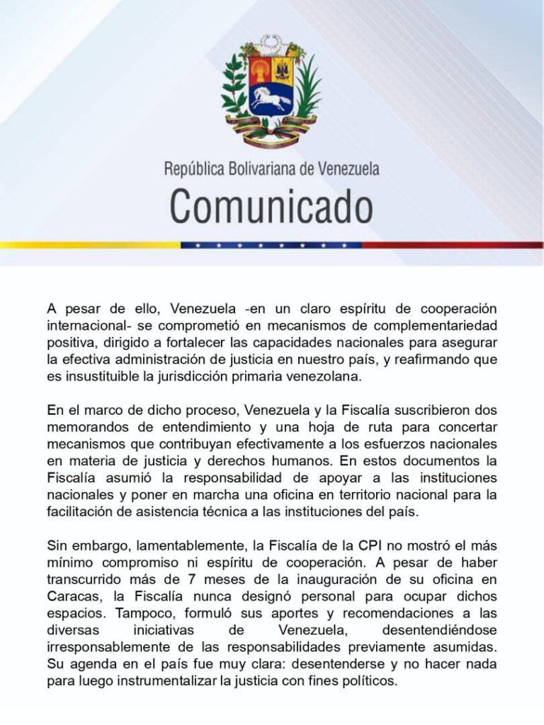 La Administración de Maduro dijo que la agenda de la CPI en el país fue «muy clara, desentenderse y no hacer nada para luego instrumentalizar la justicia con fines políticos».