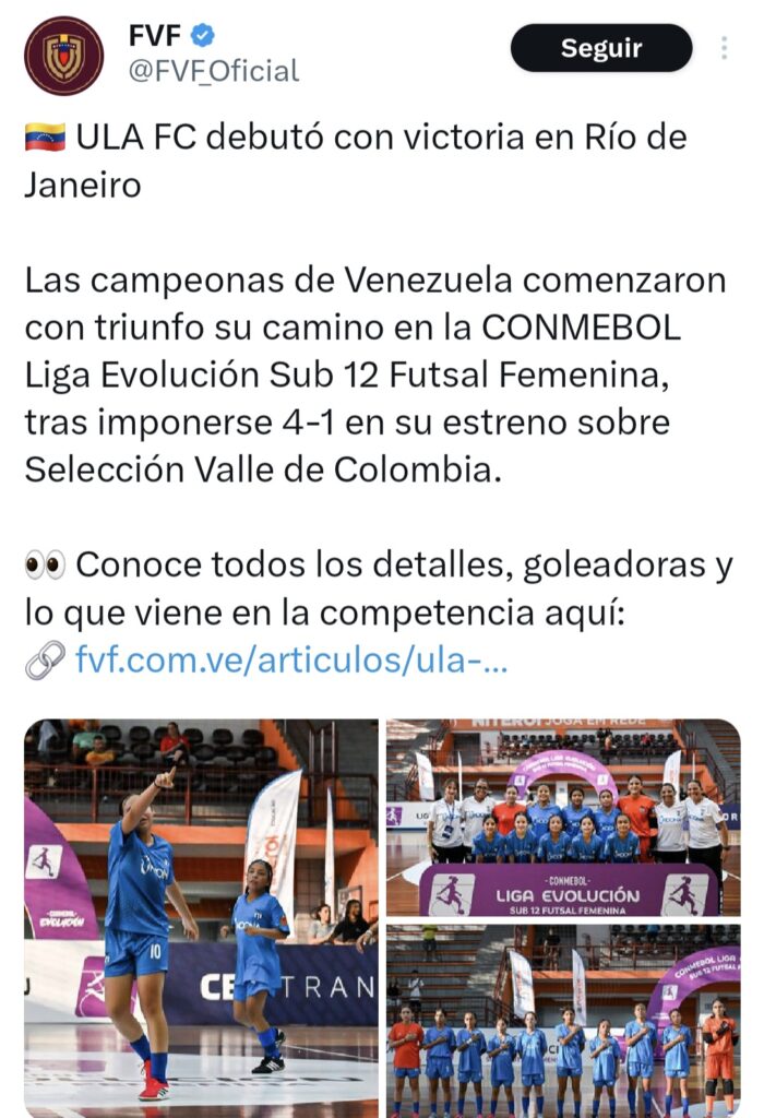 El equipo de Venezuela, la ULA FC, comenzó con victoria su participación en la Liga Evolución Sub 12 Futsal Femenina al imponerse 4-1 a la Selección Valle de Colombia en la jornada inaugural del torneo que se disputa en Río de Janeiro, Brasil.La Federación Venezolana de Fútbol (FVF) informó en su página web que Venezuela compite en el torneo luego de hacerse campeón en la Liga de Desarrollo de Futsal Sub 13 Femenino de la FVF.