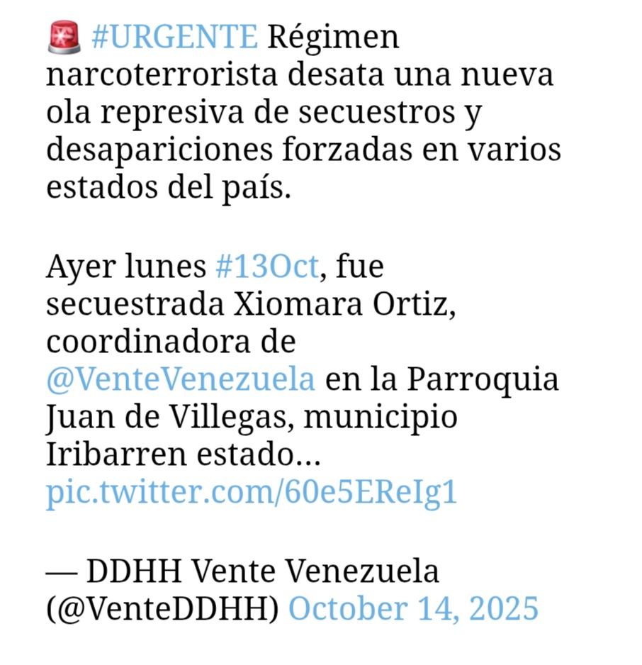 Mediante una publicación en la red social X, la organización aseguró que el “régimen narcoterrorista desata una nueva ola represiva de secuestros y desapariciones forzadas en varios estados del país”.