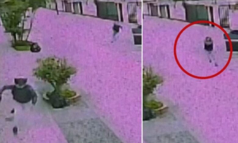 Cámaras de seguridad de la zona captaron el momento del intento de asalto. Se ve llegar a dos sujetos a bordo de una motocicleta, cuando hicieron disparos al aire.