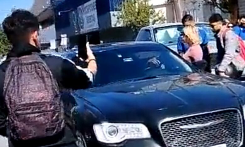 En las imágenes se ve cómo un grupo de jóvenes estudiantes rodean el auto mientras la mujer desesperada golpea el automóvil