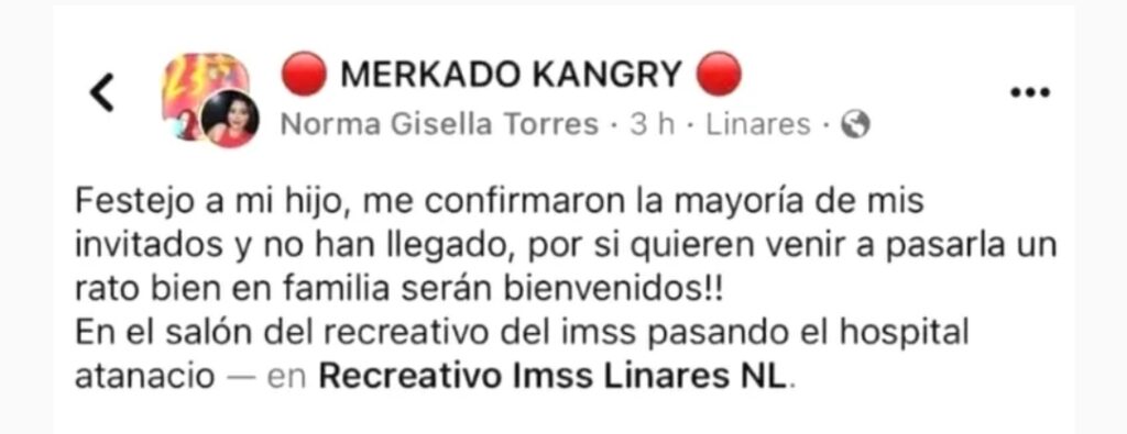 “Festejo a mi hijo, me confirmaron la mayoría de mis invitados y no llegaron, por si quieren venir a pasarla un rato bien en familia serán bienvenidos. En el salón recreativo del IMSS pasando el hospital Atanacio”, expresó la mujer, quien brindó una ubicación de Linares, una ciudad del estado de Nuevo León en México.